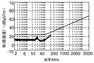 對(duì)RE102 試驗(yàn)項(xiàng)目進(jìn)行觀察,發(fā)現(xiàn)測(cè)試結(jié)果圖的超標(biāo)點(diǎn)為24 MHz、36 MHz 兩點(diǎn),而這兩點(diǎn)分別是12 MHz 頻率點(diǎn)的二三次諧波。為了找到這一頻率點(diǎn)的元器件,對(duì)機(jī)箱內(nèi)各單元進(jìn)行了分析,發(fā)現(xiàn)控制保護(hù)單元中有一個(gè)12MHz 晶振,由于晶振屬于高噪聲元器件,能夠產(chǎn)生較強(qiáng)的輻射,從而使其周邊充滿著近場(chǎng)輻射場(chǎng)。如果輻射場(chǎng)內(nèi)有器件或走線,晶振及其諧波信號(hào)將耦合到器件或走線上而輻射出去;再者又發(fā)現(xiàn)控制保護(hù)單元的PCB 板未采取就近接地措施,只是通過一根長(zhǎng)引線和機(jī)殼地相連,造成信號(hào)的環(huán)路面積增大,產(chǎn)生了很強(qiáng)的輻射,所以對(duì)控制保護(hù)單元采取措施應(yīng)該是行之有效的。首先對(duì)晶振進(jìn)行屏蔽且屏蔽體就近接地,弱化輻射發(fā)射強(qiáng)度; 然后控制保護(hù)單元的PCB 板同樣采取就近接地措施,并且在屏蔽盒出口處的信號(hào)線上安裝一個(gè)鐵氧體磁環(huán),可以將不需要的高頻干擾抑制掉。通過采取以上措施后,RE102 試驗(yàn)指標(biāo)合格,如圖3 所示。