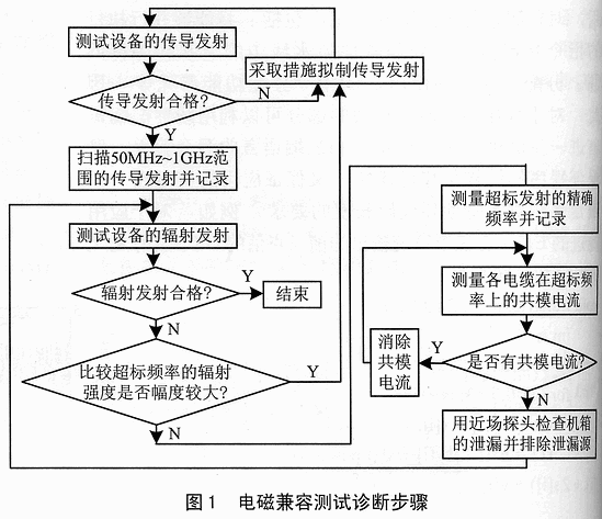 圖1給出了一個設(shè)備或系統(tǒng)的電磁干擾發(fā)射與故障分析步驟。按照這個步驟進(jìn)行,可以提高測試診斷的效率。