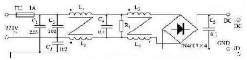 采用無源的EMI濾波器是抑制傳導(dǎo)干擾最有效的辦法。即在電路中插入一個帶通濾波器,讓50 Hz交流電暢通,其余頻率的信號受阻。但要嚴(yán)格控制濾波器LC元件的寄生參數(shù),它們的制作工藝、安裝位置、走線方式,都會影響EMI濾波效果。加接圖1所示的濾波電路,可以控制通過傳導(dǎo)耦合進(jìn)入電網(wǎng)的噪聲電平。