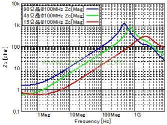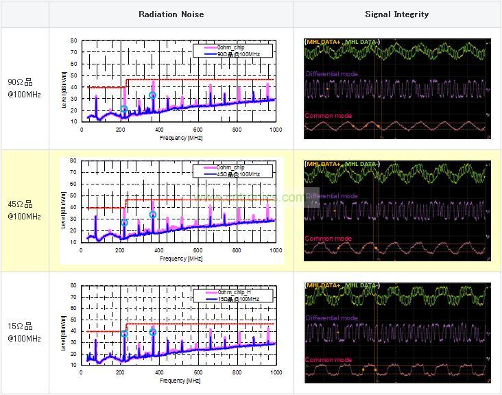 使用共模扼流線圈時的靜噪效果及信號波形評測圖5顯示的MHL信號線使用各種共模扼流線圈時的輻射噪聲/信號波形評測結果。共模扼流線圈在產生噪聲的30MHz~1GHz頻率段內,按照阻抗由高到低的順序,分別使用以下3種類型(90Ω、45Ω、15Ω@100MHz) (靜態(tài)特性請參考圖6) 來進行測量。