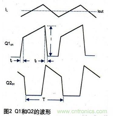當Q1關(guān)斷、Q2導(dǎo)通時,就形成了第二個回路。之后存儲在L1內(nèi)的能量流經(jīng)輸出電容器和Q2,如圖5所示。這些回路面積控制對于降低電磁干擾是很重要的,在PCB走線布線時就要預(yù)先考慮清器件的布局問題。當然,回路面積能做到多小也是有實際限制的。