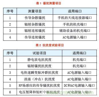 雖然手機(jī)的制式不同,但是電磁兼容要測(cè)試的項(xiàng)目相同,根據(jù)不同的要求來選擇需要測(cè)試的項(xiàng)目,電磁兼容測(cè)試項(xiàng)目見表1和表2。