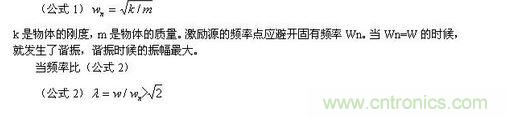 頻率可分為固有頻率Wn和激勵(lì)頻率W,固有頻率源于產(chǎn)品的結(jié)構(gòu)特征,由質(zhì)量、質(zhì)量分布、質(zhì)心位置、剛度等多個(gè)因素和多個(gè)因素間的相互作用所確定。固有頻率計(jì)算公式為(公式1)k是物體的剛度,m是物體的質(zhì)量。激勵(lì)源的頻率點(diǎn)應(yīng)避開(kāi)固有頻率Wn。當(dāng)Wn=W的時(shí)候,就發(fā)生了諧振,諧振時(shí)候的振幅最大。