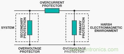 圖5顯示一個典型保護方案,其特征是具有兩重保護:主保護和次級保護。主保護可將大部分瞬變能量從系統(tǒng)轉移開,通常位于系統(tǒng)和環(huán)境之間的接口。它旨在將瞬變分流至地,從而消除大部分能量。