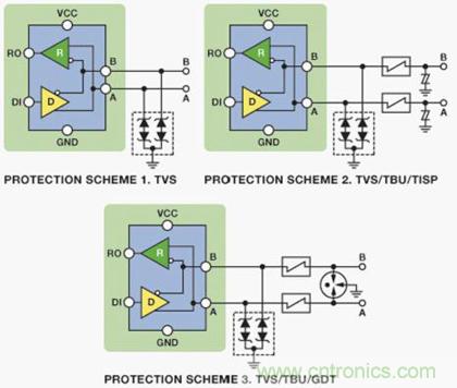 圖6所示電路顯示了三種不同的完整的EMC兼容解決方案。每個解決方案都經(jīng)過獨立外部EMC兼容性測試公司的認證,各方案使用精選的Bourns外部電路保護元件,針對ADI公司具有增強ESD保護性能的ADM3485E 3.3 V RS-485收發(fā)器提供不同的成本/保護級別。所用的Bourns外部電路保護元件包括瞬態(tài)電壓抑制器(CDSOT23-SM712)、瞬態(tài)閉鎖單元(TBU-CA065-200-WH)、晶閘管電涌保護器(TISP4240M3BJR-S)和氣體放電管(2038-15-SM-RPLF)。