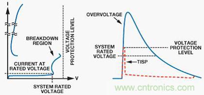 TISP的非線性電壓-電流特性通過轉移產(chǎn)生的電流來限制過壓。作為晶閘管,TISP具有非連續(xù)電壓-電流特性,它是由于高電壓區(qū)和低電壓區(qū)之間的切換動作而導致的。圖8顯示了器件的電壓-電流特性。在TISP器件切換到低電壓狀態(tài)之前,它具有低阻抗接地路徑以分流瞬變能量,雪崩擊穿區(qū)域則導致了箝位動作。在限制過壓的過程中,受保護電路短暫暴露在高壓下,因而在切換到低壓保護導通狀態(tài)之前,TISP器件處在擊穿區(qū)域。TBU將保護下游電路,防止由于這種高電壓導致的高電流造成損壞。當轉移電流降低到臨界值以下時,TISP器件自動復位,以便恢復正常系統(tǒng)運行。