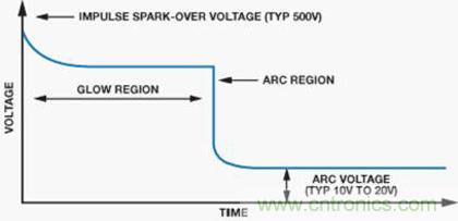 圖9顯示GDT的典型特性。當GDT兩端的電壓增大時,放電管中的氣體由于產(chǎn)生的電荷開始電離。這稱為輝光區(qū)。在此區(qū)域中,增加的電流將產(chǎn)生雪崩效應,將GDT轉換為虛擬短路,允許電流通過器件。在短路事件中,器件兩端產(chǎn)生的電壓稱為弧電壓。輝光區(qū)和電弧區(qū)之間的轉換時間主要取決于器件的物理特性。