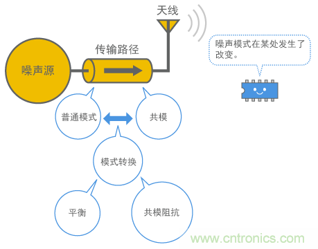這可以理解為,當(dāng)噪聲傳輸路徑中電流出現(xiàn)輕微不平衡時(shí),成分以共模的形式出現(xiàn)。