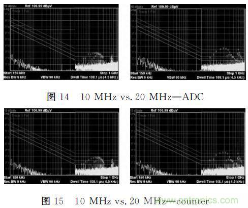 ①從電源端口結(jié)果來看,區(qū)別很小,下面以VDD1為例進行分析說明。VDD1測試選取了ADC和counter(數(shù)字計數(shù)器)的程序,以比較不同類別的程序?qū)?shù)字供電是否有影響,測試結(jié)果如圖14、圖15所示。