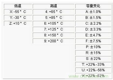 按極性分為:有極性電容和無極性電容。無極性電容(主要指陶瓷電容)的參數(shù)(電介質(zhì)材料類別,溫度特性以及誤差等參數(shù))選擇在一些設(shè)計(jì)中是比較關(guān)鍵的。表1為電容的溫度與容量誤差編碼表。如X7R電容表示電容工作的溫度范圍是-55-125℃,容量變化范圍是±15%。