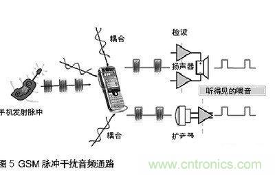 當(dāng)手機(jī)與基站通訊,或兩個手機(jī)彼此接近時,發(fā)射脈沖通過擴(kuò)音器,揚(yáng)聲器,或頭戴式耳機(jī)線傳人音頻通路。見圖5。結(jié)果是音頻質(zhì)量大幅降低。