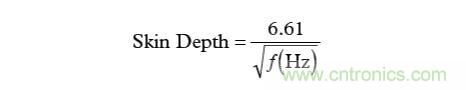 在高頻段,必須考慮一種稱為“趨膚效應(yīng)”的現(xiàn)象。趨膚效應(yīng)會(huì)引起電流流向?qū)Ь€的外表面--結(jié)果會(huì)使得導(dǎo)線的橫截面變窄,因此使直流(DC)電阻增大。雖然趨膚效應(yīng)超出了本文討論的范圍,這里還是給出銅線中趨膚深度(SkinDepth)的一個(gè)很好的近似公式(以cm為單位):