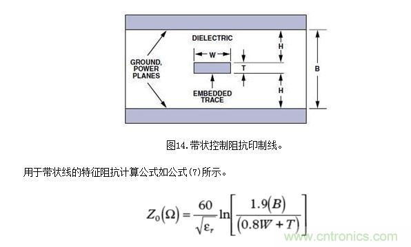 帶狀控制阻抗印制線(參見(jiàn)圖14)采用了兩層接地平面,信號(hào)印制線夾在其中。這種方法使用了較多的印制線,需要的PCB層數(shù)更多,對(duì)電介質(zhì)厚度變化敏感,而且成本更高--所以通常只用于要求嚴(yán)格的應(yīng)用中。