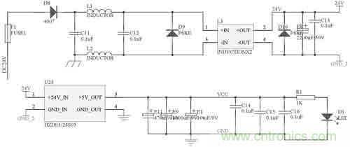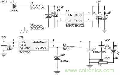 本控制模塊的電源電路如圖2所示。車載蓄電池—發(fā)電機的電源從24V_1處進入,二極管D16主要是防止電源的正負極被誤接反。電感L1、L2對電源進行濾波,和共模電感L3、電容C8配合,可以過濾掉電源中的尖峰脈沖。二極管D24 P6KE51A是脈沖干擾抑制器(TVS),它可以快速吸收超過額定電壓的尖峰脈沖,瞬時通過電流很大,最大功率可達500~1000W。電容E5和C9進一步對電源進行濾波。過濾干凈的電流通過開關(guān)電源芯片LM2576變換為系統(tǒng)使用的5V電源。電容E7和C11對輸出5V電源進行濾波,電阻R18和發(fā)光二極管D28指示當前是否有電。
