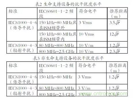 在IEC 60601-1-2《醫(yī)用電氣設(shè)備第1-2部分:安全通用要求并列標(biāo)準(zhǔn):電磁兼容要求和試驗(yàn)》中,規(guī)定了對(duì)生命支持設(shè)備和非生命支持設(shè)備的電磁抗擾度,他們的抗干擾水平分別為10 V/m和 3V/m 。生命支持設(shè)備主要指呼吸機(jī)、血透機(jī)等對(duì)維持患者生命起著關(guān)鍵作用的醫(yī)療設(shè)備,相較于非生命支持設(shè)備,這類設(shè)備的安全性能要求更為嚴(yán)格,抗電磁干擾水平也高于非生命支持設(shè)備。在IEC61000-4-3《電磁兼容性(EMC)第4-3部分:測試及測量技術(shù)—放射性、射頻式、電磁場抗干擾度試驗(yàn)》針對(duì)所有電子電氣設(shè)備的電磁兼容標(biāo)準(zhǔn)中,醫(yī)療設(shè)備屬于其中的水平等級(jí)3和水平等級(jí)2。低頻率的干擾主要來源于傳導(dǎo)發(fā)射產(chǎn)生的干擾電壓;而高頻率的干擾主要來源于輻射發(fā)射產(chǎn)生的電磁干擾場強(qiáng)。同時(shí)在IEC60601-1-2標(biāo)準(zhǔn)中,也給出了在電磁環(huán)境中醫(yī)療設(shè)備抗干擾度的推薦距離,在相同的發(fā)射功率下,生命支持設(shè)備的抗電磁干擾水平要高于非生命支持設(shè)備,推薦距離也相對(duì)較遠(yuǎn),如表2~3所示。