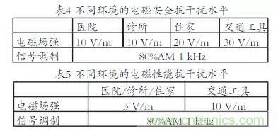 在過去關(guān)于醫(yī)療設(shè)備抗電磁干擾的標(biāo)準(zhǔn)中,往往僅考慮醫(yī)療設(shè)備在醫(yī)院內(nèi)的使用情況。但隨著科技的發(fā)展,許多設(shè)備逐漸變得輕巧、簡便,方便患者在各個(gè)地點(diǎn)使用,特別是一些便攜式、植入式及可穿戴的醫(yī)療設(shè)備。例如植入式的心臟起搏器,要保證在各種場所能正常安全地工作,不會(huì)被其他電子發(fā)射信號(hào)或設(shè)備干擾。因此IEC60601-1-4《醫(yī)用電氣設(shè)備第1-4部分:基本安全和必要性能的通用要求:電磁干擾的測試和要求》,提出了電磁環(huán)境的分類以及如何根據(jù)環(huán)境來合理地確定抗干擾水平。在這版標(biāo)準(zhǔn)中,強(qiáng)調(diào)了不同的電磁環(huán)境,分別是醫(yī)院、診所、住家、交通工具。不同環(huán)境中的醫(yī)療設(shè)備所需的抗干擾水平,見表4~5。