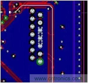 比如在EMC試驗(yàn)時(shí),MCU的ADC采集到的信號(hào)被干擾到了,則除了在原理圖上分析外,在PCB上講該信號(hào)高亮出來(lái),然后再耐心尋找該信號(hào)的回流路徑是否有不順暢的地方: