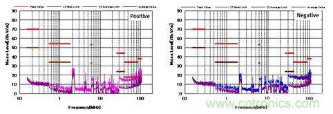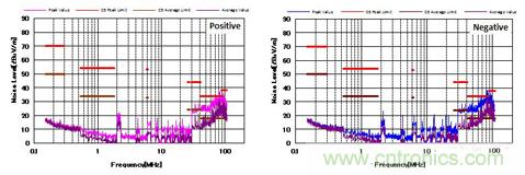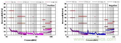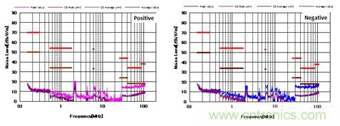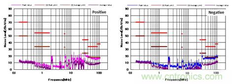 圖4顯示了增加CM和DM濾波器后的噪聲特性。 與圖3相比,CM濾波器的增加降低了近20dBμV/ m的CM噪聲。 并且EMI性能也通過了CISPR25 C5標(biāo)準(zhǔn)。