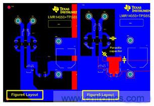 圖4和圖5之間噪聲結(jié)果的不同主要是由于PCB布線差異所致,如圖6所示。圖5的布線中(圖6的右側(cè)),大面積覆銅(GND)包圍著DM濾波器,并和Vin走線形成了一些寄生電容。 這些寄生電容為高頻信號(hào)旁路濾波器提供了有效的低阻抗路徑。 因此,為了最大限度地提高濾波器的性能,需要移除濾波器周圍所有的覆銅,如圖6左側(cè)的布線。