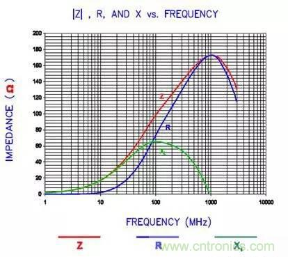 從等效電路中可以看到,當(dāng)頻率低于fL(LC諧振頻率)時(shí),磁珠呈現(xiàn)電感特性;當(dāng)頻率等于fL時(shí),磁珠是一個(gè)純電阻,此時(shí)磁珠的阻抗(impedance)最大;當(dāng)頻率高于諧振頻率點(diǎn)fL時(shí),磁珠則呈現(xiàn)電容特性。EMI選用磁珠的原則就是磁珠的阻抗在EMI噪聲頻率處最大。比如如果EMI噪聲的最大值在200MHz,那你選擇的時(shí)候就要看磁珠的特性曲線,其阻抗的最大值應(yīng)該在200MHz左右。下圖是一個(gè)磁珠的實(shí)際的特性曲線圖。大家可以看到這個(gè)磁珠的峰值點(diǎn)出現(xiàn)在1GHz左右。在峰點(diǎn)時(shí),阻抗(Z)曲線的值與電阻(R)的相等。也就是說(shuō)這個(gè)磁珠在1GHz時(shí),是個(gè)純電阻,而且阻抗值最大。