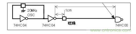 我們將兩個(gè)磁珠分別放在如下的20MHz的信號(hào)線上,看看對(duì)信號(hào)輸出會(huì)產(chǎn)生什么樣的影響。