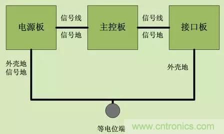 靜電要得到有效釋放,就要保證良好的接地。對于醫(yī)療電子,一般的醫(yī)療電子產(chǎn)品比如監(jiān)護(hù)儀,機(jī)身后面都會有一個等電位接地端。在做ESD試驗的時候,這個接地 端也是要接大地的,這樣就有了一個靜電快速泄放的途徑。如圖5.1,假如主電路板分為三個模塊:電源板,主控板和接口板,接口板的接口外殼地要和信號地分 開,然后接口板的外殼地和等電位端用粗導(dǎo)線相連。系統(tǒng)的信號地可以從電源板的外殼地與信號地相連然后共用一根粗導(dǎo)線與等電位端相連。之所以沒有采用每塊板 都分別接到等電位端的星形接地方法,是因為星形接地會形成接地環(huán)路,從而增加射頻噪聲和容易受電磁干擾。