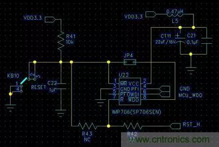 本人有一次對整機(jī)EMC整改,ESD試驗時,按鍵控制板的MCU老是復(fù)位。后來用示波器進(jìn)行追蹤,發(fā)現(xiàn)是外部看門狗芯片發(fā)生復(fù)位,導(dǎo)致MCU復(fù)位。于是先在電源上并接TVS管,還是會復(fù)位;再在看門狗芯片VCC管腳旁并接22uF鉭電容,情況好一些,但還是會復(fù)位;最后再串接一個0.47uH的貼片電容,組成LC濾波(如圖3.1所示)。在+-6KV的ESD接觸放電下,就再也不會復(fù)位,而且工作正常。