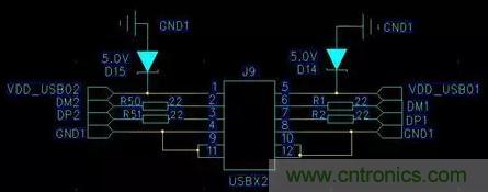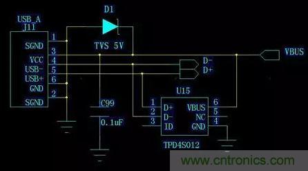 對外接口的信號線同樣需要保護(hù),否則靜電經(jīng)過信號線直接到達(dá)芯片IO管腳,雖然芯片的IO都有二極管保護(hù),一般可以抵御+-2KV的靜電,但是對于+-6KV的ESD接觸放電,就會遭遇損壞的風(fēng)險。同樣是USB接口,如圖2.1,差分信號線D+和D-接了個ESD器件TPD4S012,實際上是與USB電源和地并接反向二極管,把電流導(dǎo)向USB電源或者地。