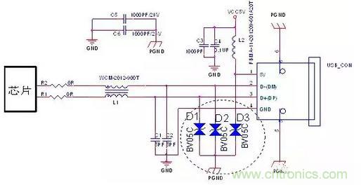 D1、D2、D3選用TVS,TVS反向關(guān)斷電壓為5V。TVS管的結(jié)電容對信號(hào)傳輸頻率有一定的影響,usb2.0的TVS結(jié)電容小于5pF;