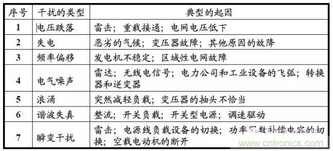 造成電磁干擾復(fù)雜性(特別電源線干擾的復(fù)雜性)的第二個原因是干擾表現(xiàn)的形式很多,可以從持續(xù)期很短的尖峰干擾直至電網(wǎng)完全失電。其中也包括了電壓的變化(如電壓跌落、浪涌和中斷)、頻率變化、波形失真(包括電壓和電流的)、持續(xù)噪聲或雜波,以及瞬變等等。下表是經(jīng)常可以見到的干擾類型和它們的起因: