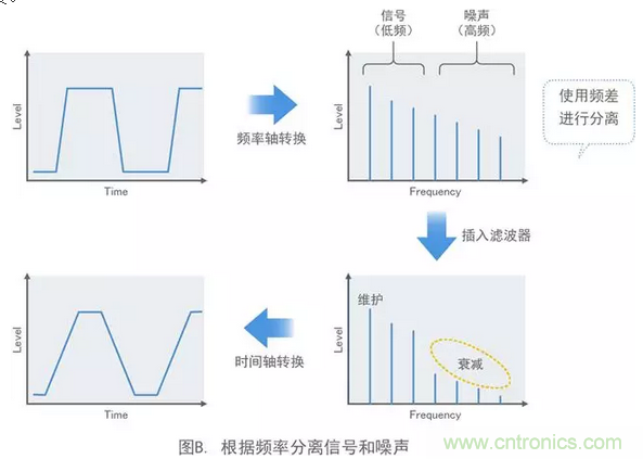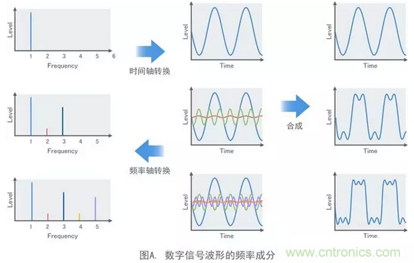 在我學(xué)生時(shí)代碰到的噪聲中,計(jì)算機(jī)的時(shí)鐘頻率約為4MHz。但是,例如在日本,用于調(diào)頻廣播的頻段為76MHz或更高。噪聲源的時(shí)鐘頻率不會(huì)與廣播頻率重疊。那問題為什么會(huì)出現(xiàn)呢?數(shù)字信號(hào)是由基波正弦波和其整數(shù)倍的諧波組成的方波,如圖A所示。方波的上升越急劇,其包含的高次諧波分量越高。這意味著實(shí)際的數(shù)字信號(hào)具有與調(diào)頻廣播頻帶重疊的諧波分量,從而導(dǎo)致調(diào)頻收音機(jī)的聲音中產(chǎn)生噪聲。