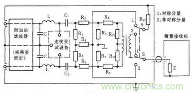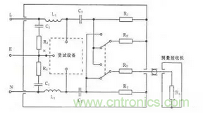 連續(xù)騷擾電壓測(cè)量主要測(cè)量EUT沿著電源線向電網(wǎng)發(fā)射的騷擾電壓,測(cè)量頻率為0.15~30MHz。測(cè)量一般在屏蔽室內(nèi)進(jìn)行。測(cè)量時(shí)需要在電網(wǎng)和EUT之間插入一個(gè)人工電源網(wǎng)絡(luò)(LISN或AMN),其原理如圖15所示。AMN的作用是隔離電網(wǎng)和EUT,使測(cè)到的騷擾電壓