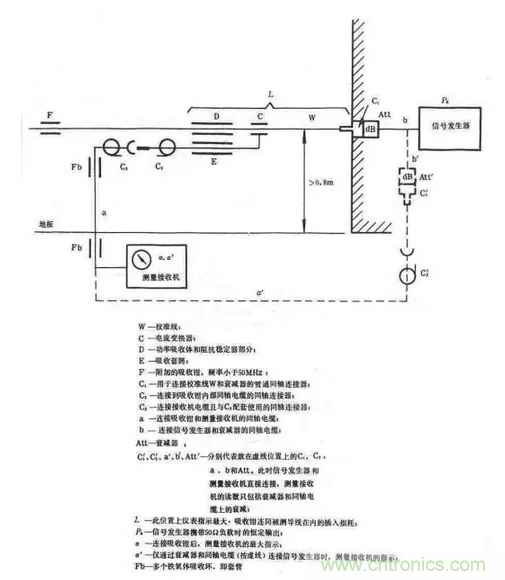 電纜上產(chǎn)生的共模電流,以免影響測(cè)量結(jié)果。測(cè)量布置如圖19(b)所示,測(cè)試應(yīng)在屏蔽室內(nèi)進(jìn)行,電源線長(zhǎng)度應(yīng)大于6m,即大于30MHz的半波長(zhǎng)加上吸收鉗的長(zhǎng)度。對(duì)于每一個(gè)測(cè)試頻率點(diǎn),吸收鉗都應(yīng)沿著電源線移動(dòng),找出最大值,因?yàn)楣材k娏髟趯?dǎo)線上是以駐波形式出現(xiàn)的。功率吸收鉗測(cè)量系統(tǒng)應(yīng)事前進(jìn)行校準(zhǔn),得到修正因子—頻率曲線。校準(zhǔn)布置如圖20所示。