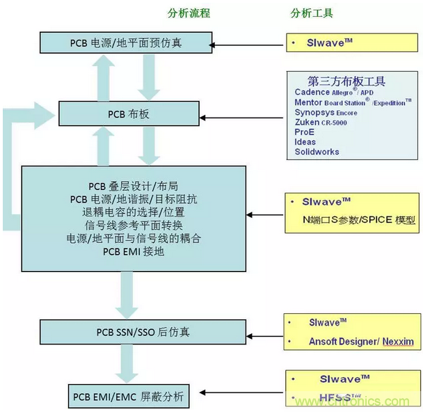 美國(guó)ANSYS公司是全球最大的CAE仿真軟件提供商,其產(chǎn)品涉及領(lǐng)域跨電磁,流體,結(jié)構(gòu)和熱等多個(gè)領(lǐng)域。其中電磁仿真軟件覆蓋射頻微波、PCB SI/PI/EMC、芯片設(shè)計(jì)驗(yàn)證、機(jī)電系統(tǒng)等領(lǐng)域。ANSYS 公司具備完備的系統(tǒng)電磁兼容仿真平臺(tái),包括:高速設(shè)計(jì)環(huán)境和仿真平臺(tái)Designer SI(包含瞬態(tài)非線性電路仿真和快速眼圖、眼圖驗(yàn)證和瞬態(tài)眼圖),專門針對(duì)PCB整版全波仿真的SIwave, 高頻結(jié)構(gòu)仿真工具HFSS,用于機(jī)箱屏蔽設(shè)計(jì)和系統(tǒng)EMI/EMC仿真,優(yōu)化和參數(shù)掃描模塊Optimetrics,以及和EDA工具的接口Ansoftlinks for EDA, 多處理器模塊等,構(gòu)成基本軟件平臺(tái)。針對(duì)不同類型的結(jié)構(gòu),利用針對(duì)性的電磁場(chǎng)進(jìn)行仿真合抽取,并組裝到電路仿真工具Designer SI中進(jìn)行瞬態(tài)仿真,得到模型、頻譜和眼圖,仿真的頻譜還可以用于PCB的輻射分析,并進(jìn)一步仿真PCB經(jīng)機(jī)箱屏蔽后的輻射強(qiáng)度,從而全面、精確、快速地實(shí)現(xiàn)系統(tǒng)SI/PI 和EMI/EMC設(shè)計(jì)。