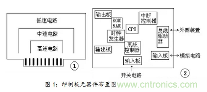 在印制板布置高速、中速和低速邏輯電路時(shí),應(yīng)按照圖1-①的方式排列元器件。