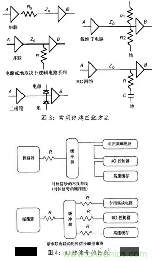 為了抑制出現(xiàn)在印制線終端的反射干擾,除了特殊需要之外,應(yīng)盡可能縮短印制線的長度和采用慢速電路。必要時(shí)可加終端匹配。終端匹配方法比較多,常見終端匹配方法見圖3所示。根據(jù)經(jīng)驗(yàn),對一般速度較快的TTL電路,其印制線條長于10cm以上時(shí)就應(yīng)采用終端匹配措施。匹配電阻的阻值應(yīng)根據(jù)集成電路的輸出驅(qū)動(dòng)電流及吸收電流的最大值來決定。時(shí)鐘信號較多采用串聯(lián)匹配,見圖4所示。