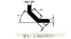 與過孔相似,直角的轉(zhuǎn)彎路徑應(yīng)該被避免,因?yàn)樗趦?nèi)部的邊緣能產(chǎn)生集中的電場。該場能耦合較強(qiáng)噪聲到相鄰路徑,因此,當(dāng)轉(zhuǎn)動(dòng)路徑時(shí)全部的直角路徑應(yīng)該采用45度。圖5是45度路徑的一般規(guī)則。