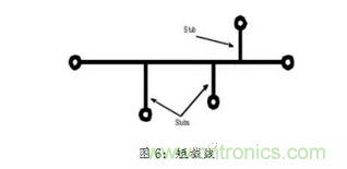 如圖6所示短截線會(huì)產(chǎn)生反射,同時(shí)也潛在增加輻射天線的可能。雖然短截線長度可能不是任何系統(tǒng)已知信號波長的四分之一整數(shù),但是附帶的輻射可能在短截線上產(chǎn)生振蕩。因此,避免在傳送高頻率和敏感的信號路徑上使用短截線。