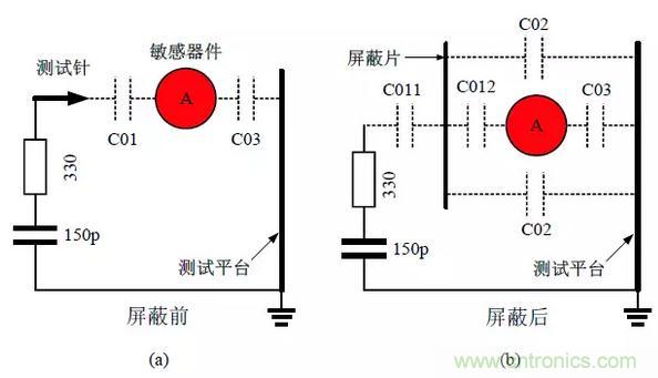 這里需要特別說明的是,對ESD 進行靜電屏蔽防護的金屬屏蔽片是可以不需要接地的。經屏蔽之后,在屏蔽片與大地之間就會增加一個分布電容C02,C02對C011 在C012、C03 產生的電壓起到分壓作用,因此,C02 與C012、C03 之比,越大越好,而C01=C011+C012=2C012(假說C011=C012)。加大C02 要盡量加大屏蔽片的有效面積,而減小C01,則應該盡量讓A 遠離測試探頭和機殼,并把敏感器件A 置于公共地的包圍圈之中。金屬屏蔽片一般選用如過濾嘴香煙包裝盒中的錫箔片最為簡便。