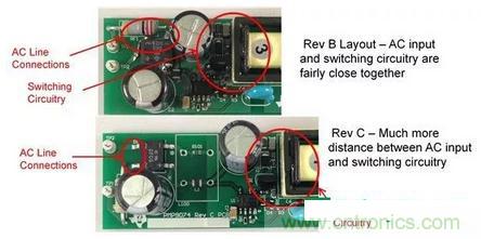 圖2:從電路板布局進(jìn)行 EMI 掃描,其中 AC 輸入與開(kāi)關(guān)電路距離較近