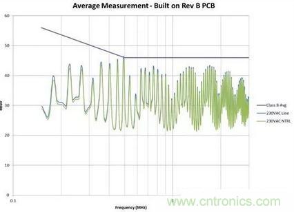 我通過(guò)簡(jiǎn)單調(diào)整電路板(無(wú)電路變化),將噪聲降低了大約 6dB。見(jiàn)圖 2 和圖 3 的測(cè)量結(jié)果。在有些情況下,接近高 dV/dt 進(jìn)行輸入線路布線甚至還可擊壞共模線圈 (CMC)。