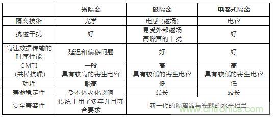 無論是光隔離、磁隔離或是電容式隔離,只要在適當(dāng)?shù)臈l件下工作都可以達到很出色的隔離效果。下圖是一個三種隔離技術(shù)的簡單比較: