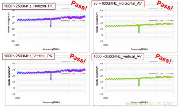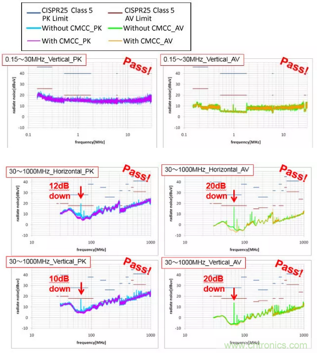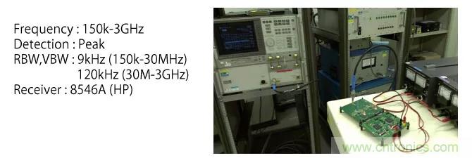 通過(guò)輻射噪聲測(cè)定確認(rèn)了共模扼流圈的降噪效果。
