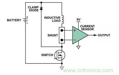 本例將詳細(xì)介紹一種典型的高端電流檢測應(yīng)用。圖1所示為汽車應(yīng)用環(huán)境中用于監(jiān)控電磁閥或其它感性負(fù)載的常見配置。