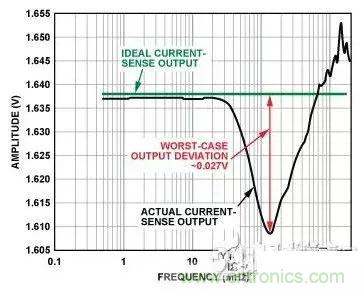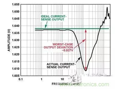 圖2所示為輸入在較寬頻率范圍內(nèi)變化時(shí)電流傳感器的直流輸出與其理想值的偏差情況。從圖中可以看出,在1 MHz至20 MHz的頻率范圍內(nèi),偏差最為顯著(》0.1 V),且3 MHz時(shí)直流誤差達(dá)到最大值(1 V),這在放大器0 V至5 V的輸出電壓范圍中占據(jù)很大比例。