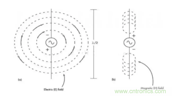 圖1展示了典型的半波偶極子天線是如何產(chǎn)生電場和磁場的。轉(zhuǎn)發(fā)后的信號被調(diào)制為正弦波,電壓呈極性變化,因此在天線的各元件間生成了電場,極性每半個周期變換一次。天線元件的電流產(chǎn)生磁場,方向每半個周期變換一次。電磁場互為直角正交。