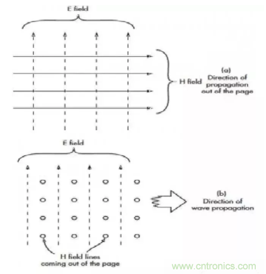 距離天線一定范圍內(nèi),電場和磁場基本為平面并以直角相交。注意傳播方向和電磁場均成直角。在圖2(a)中,傳播方向和電磁場線方向成正交,即垂直紙面向內(nèi)或向外。在圖2(b)中,磁場線垂直紙面向外,如圖中圓圈所示。