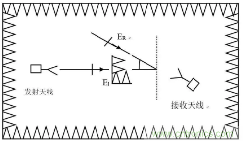 測試近場工作區(qū)反射電平時,發(fā)射天線先置于暗室中心軸線上,接收天線置于正對被測墻壁的一個合理位置,并沿兩天線軸線移動一段距離進(jìn)行反射電平的測試。測試位置如圖所示。