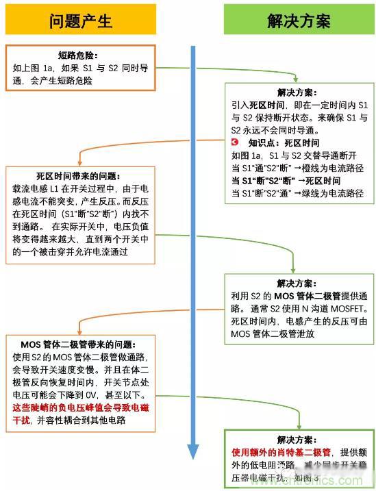 同步開關(guān)穩(wěn)壓器有一個天生的缺陷,就是當S1與S2同時導(dǎo)通時,會產(chǎn)生短路危險,這會損壞開關(guān)。所以必須確保兩個開關(guān)永遠不會同時導(dǎo)通。為了個避免這種情況發(fā)生,會采取一些措施,而這些措施可能會帶來額外的電磁干擾。我們來梳理一下這個過程是如何發(fā)生的。