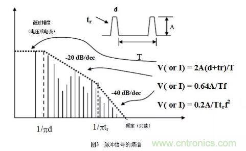 在EMC中,除了基本頻率外,還需考慮諧波因素,通常取十倍頻,但在數(shù)字電路中卻有些不同,比如在時(shí)鐘電路和邏輯門(mén)電路中,輻射帶寬與數(shù)字信號(hào)的上升沿或下降沿有關(guān)系,而不是數(shù)字信號(hào)的重復(fù)周期,其關(guān)系為:rtF?/1max?,其中rt是脈沖的上升沿時(shí)間。例如,典型時(shí)鐘驅(qū)動(dòng)的邊沿速率是2ns,此時(shí),maxF≈160MHz,再考慮十倍頻,則此時(shí)鐘電路可能產(chǎn)生直到1.6GHz的輻射帶寬。所以在選擇器件時(shí)要選擇慢速的邏輯器件系列,因?yàn)槠骷?duì)電磁輻射貢獻(xiàn)的大小與工作頻率無(wú)直接關(guān)系而只取決于邊沿速率(這和從電路功能設(shè)計(jì)上選擇快速器件是矛盾的,在電路設(shè)計(jì)時(shí)需要折中考慮)。還有從器件的抗擾能力上來(lái)說(shuō),CMOS器件是最好的,因?yàn)樗脑肼暼菹薷摺姆庋b上來(lái)說(shuō),BGA是最好的,因?yàn)樗囊€很短。脈沖信號(hào)的頻譜如圖3所示。